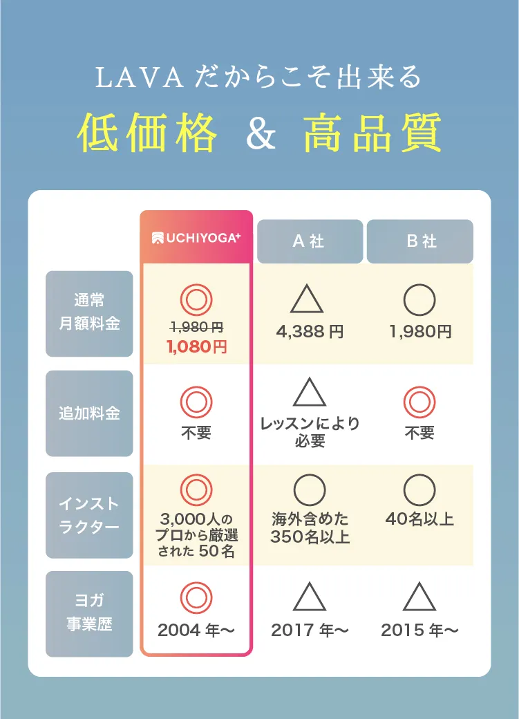 「うちヨガ+」の最大の強みは、ホットヨガスタジオ業界No.1のLAVAの人気インストラクターがレッスンを担当していることです。スタジオと同じクオリティで、ポーズや呼吸の指導が丁寧なので、初心者でも安心して取り組めます。また、質の高いレッスンが1回あたり99円〜受けられるため、費用面でも継続しやすいサービスです。